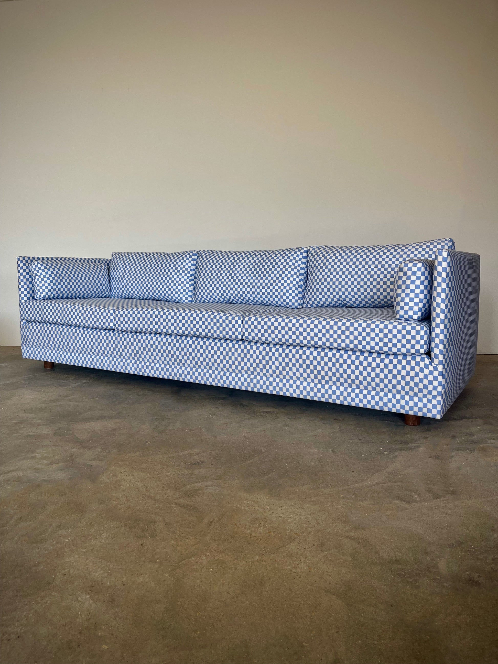 vintage low-profile sofa with a fresh, modern twist! baby blue checkered upholstery and new foam seats make it a perfect pop of fun in any room